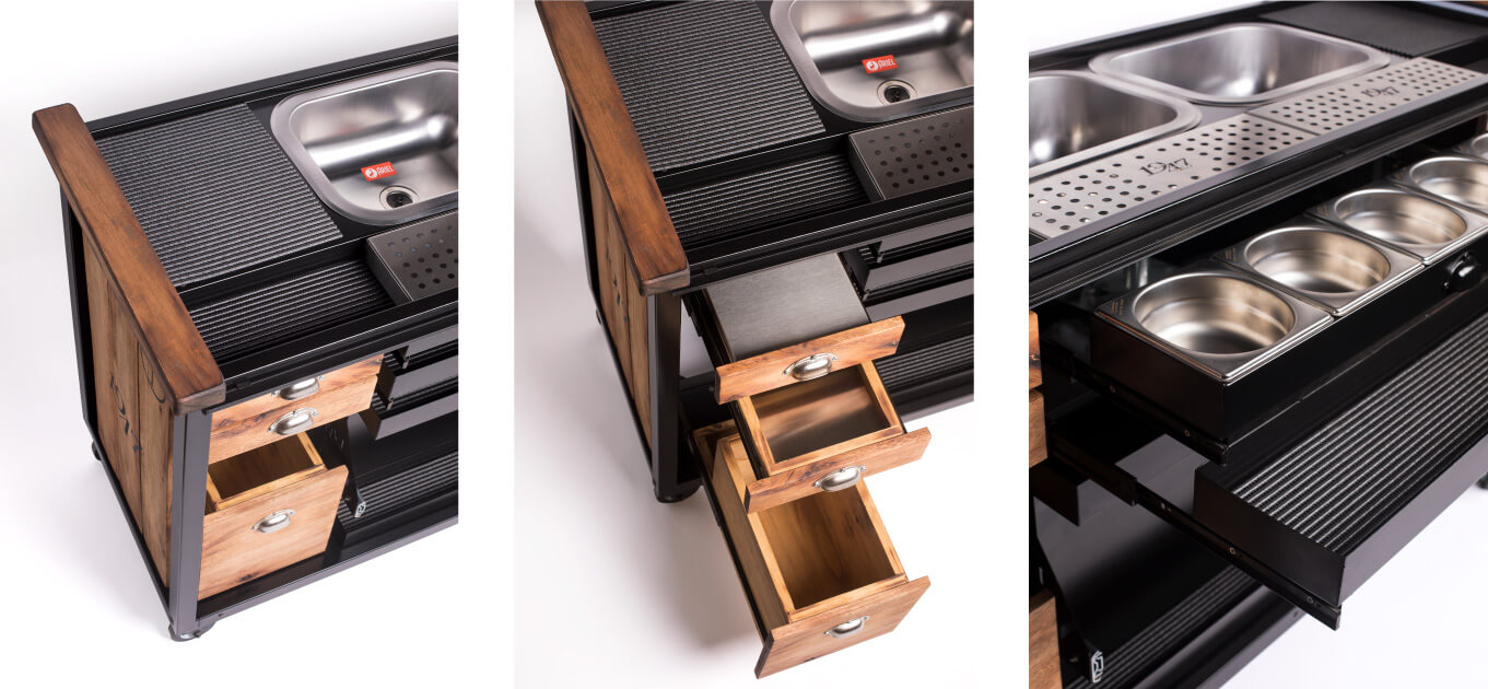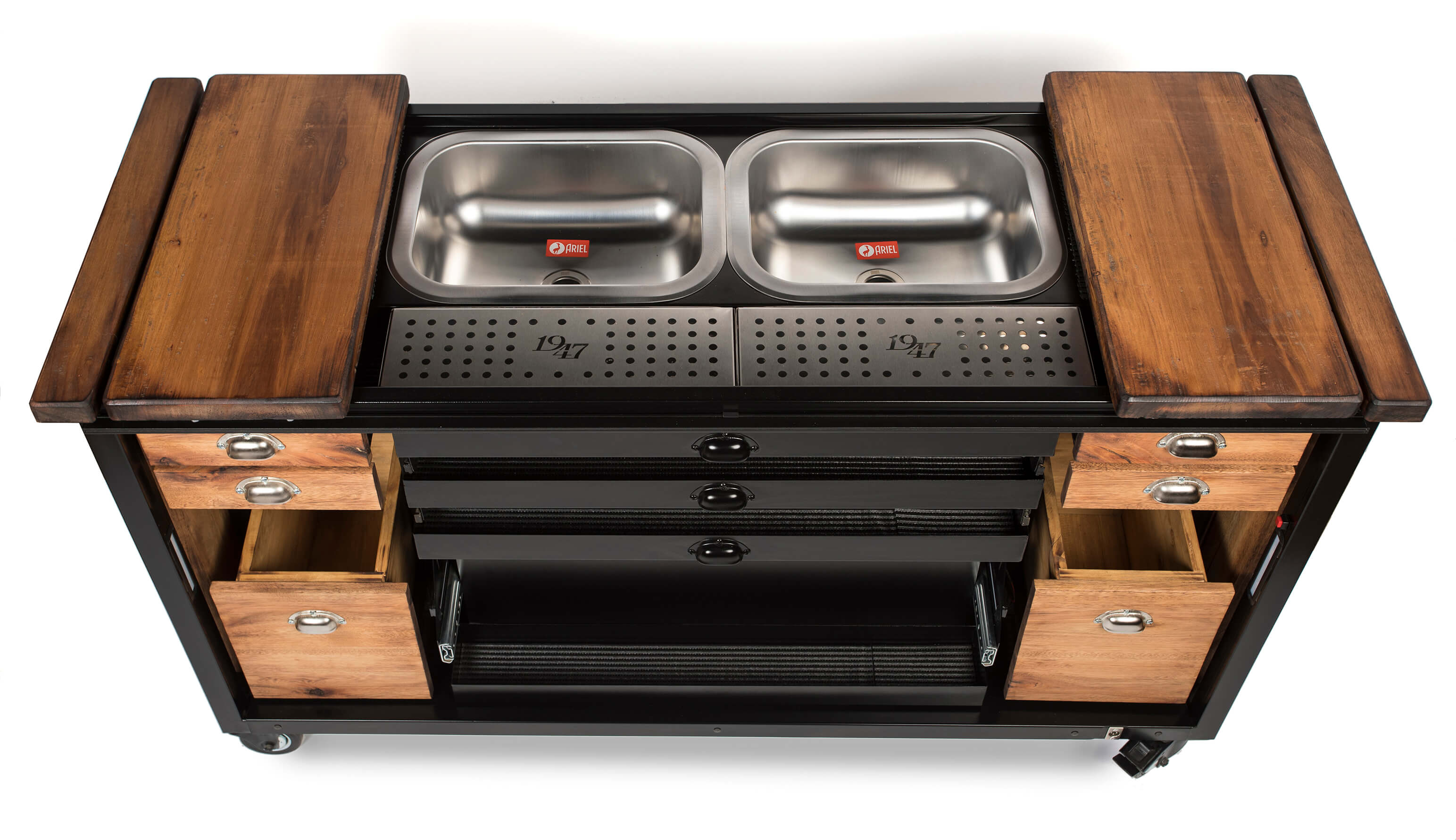 - Mesada de chapa plegada, pintada en color negro semi mate. Con 2 bachas marca Johnson, que podrán utilizarse para enfriar bebidas con hielo o para cubos de hielo en la utilización de tragos.
